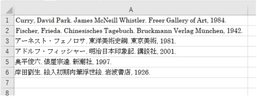 Wordでは、「参考資料」タブの「資料文献の管理」ボタンで、引用や参照した文献を登録できる。こちらに文献を登録しておくと「文献目録」ボタンで文献一覧を簡単に作成できる。上図はWordで作った「Chicago」形式(引用スタイル)の文献一覧をコピーしてExcelにペーストしたものだ。