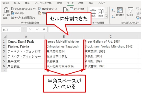 著者名や書名を別々のセルに分割できた。図では分割したあとセル幅を適宜調整している。しかし、B列とC列の各セルをよく見ると、頭に余分な半角スペースが入っている