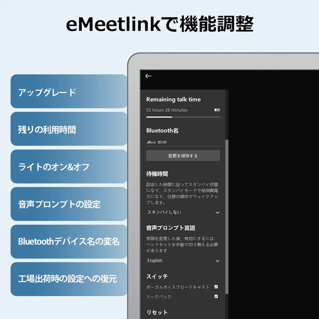 EMEET独自のソフトウェアで、bluetoothデバイス名の変名、ソフトウェアのアップグレード、ライト/着信音の設定、工場出荷時の設定への復元などの設定が自由に調整できる。また、必要に応じて、ヘッドセットのボリューム調整ボタンやミュートボタンを押すことで、便利にボリュームの調整や音拾いの中止ができる。