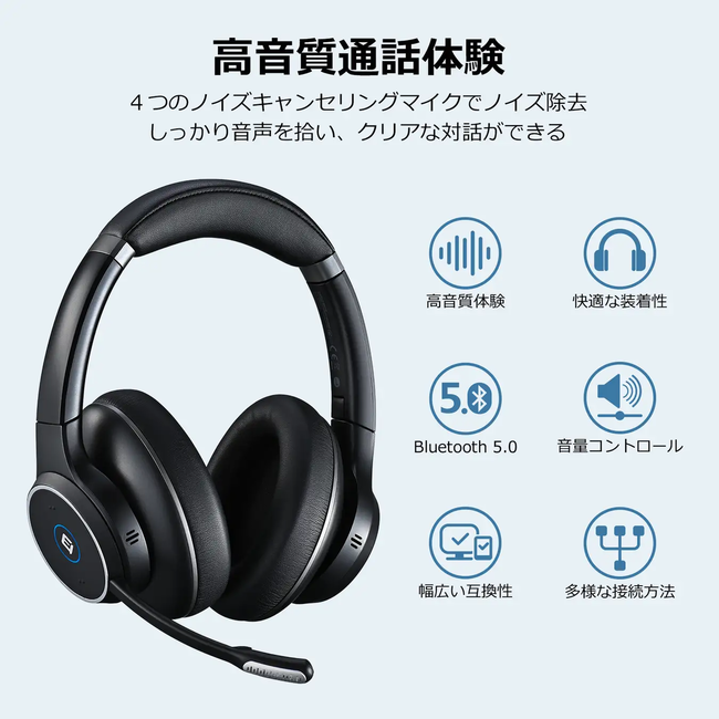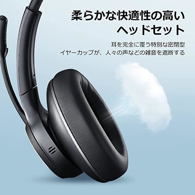 ブームは120°回転するので、マイクが必要ない際は、ブームを回転させて邪魔にならない位置にセットすることも可能。また、折り畳み式で外出や出張の持ち運びにも便利。柔らかなパッドと快適性こだわって設計されたフォームイヤーカップを備えており、長時間でも快適に着用可能、頭や耳に負担をかけずに話や音楽に集中できる。