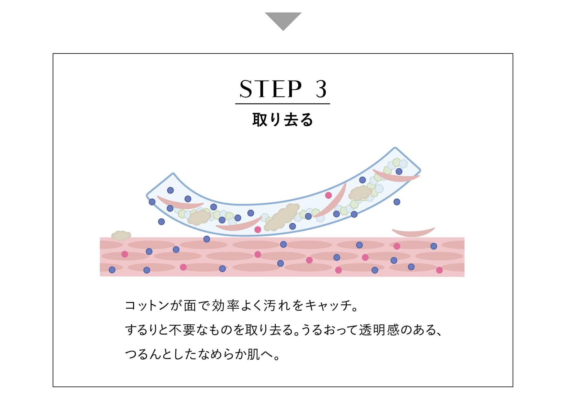 保湿成分配合のローションで、肌をうるおいで満たしながら整え、磨き上げるようにふき取ります。