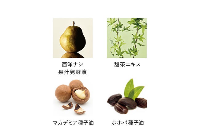 甜茶エキス(テンチャエキス)、マカデミア種子油、ホホバ種子油